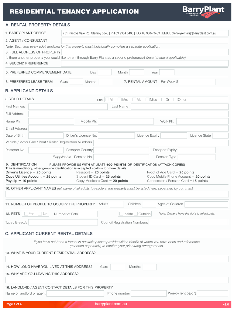 Barry Plant Pakenham Rental Application Form – A no cost leasing application permits landlords to assemble information from prospective tenants, retail store it, and assess it to create knowledgeable judgements. On the web lease app forms can be bought in various web templates, as well as the landlord can tailor the design to meet his distinct needs. Prior to renting out a house, landlords need to carry out a backdrop review the prospect, both himself or by hiring track record-check out firms. Background checks can include work data, credit score history, and past leasing record. Dependant upon the situation, referees may be required. Barry Plant Pakenham Rental Application Form.