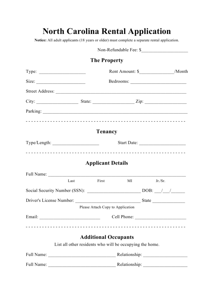 North Carolina Rental Application Form – A totally free hire form permits property owners to assemble information and facts from would-be tenants, shop it, and assess it to make well informed choices. On the internet lease software varieties can be purchased in a variety of templates, and the property owner can modify the template to meet his particular demands. Just before hiring out a house, landlords need to perform a backdrop check on the applicant, both himself or by hiring track record-verify companies. Background record checks can include work information, credit score history, and prior hire history. Depending on the circumstance, referees is usually necessary. North Carolina Rental Application Form.